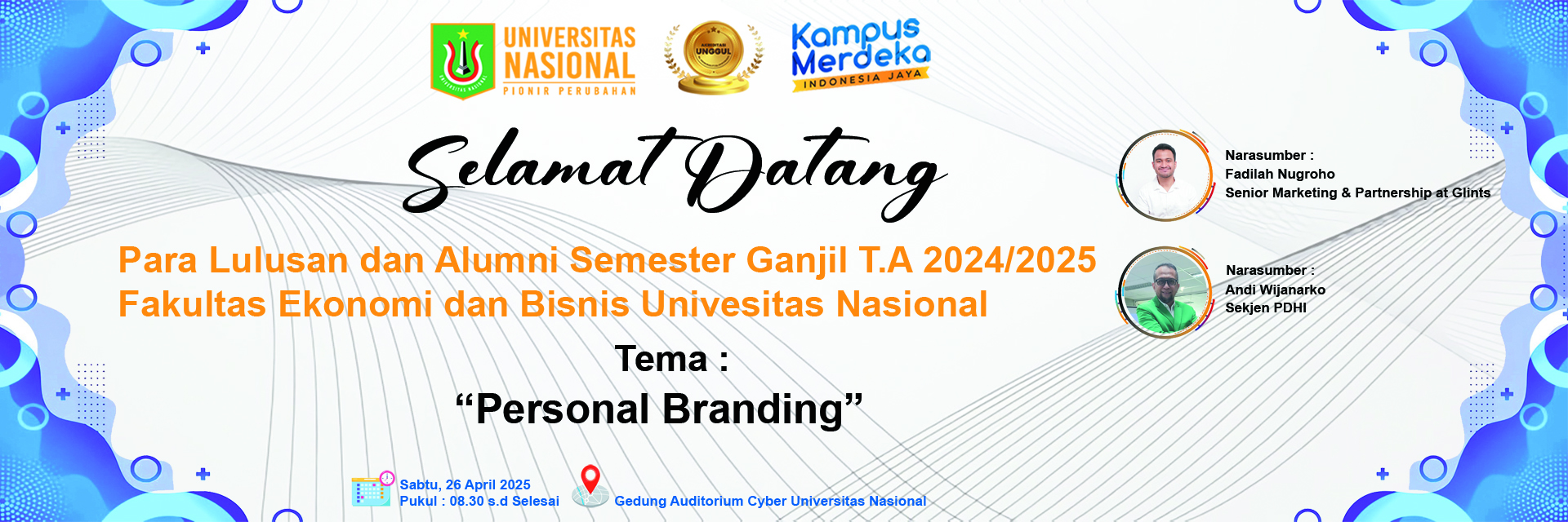 Pelepasan Lulusan dan Alumni Semester Ganjil T.A 2024/2025 Fakultas Ekonomi dan Bisnis Universitas Nasional Post author:Administrator Post published:April 25, 2025 Post category:Pengumuman You Might Also Like PENDAFTARAN PROGRAM BEASISWA BIDIKMANIS KOTA DEPOK December 3, 2024 Virtual Tech Workshop dengan Tema “How Will Artificial Intelligence (AI) Lead the Transformation in Our Economy” November 1, 2020 Program SKPI Bersertifikat BNSP May 15, 2024